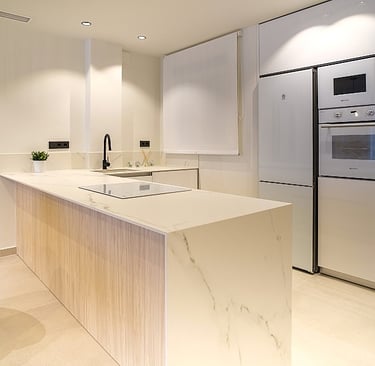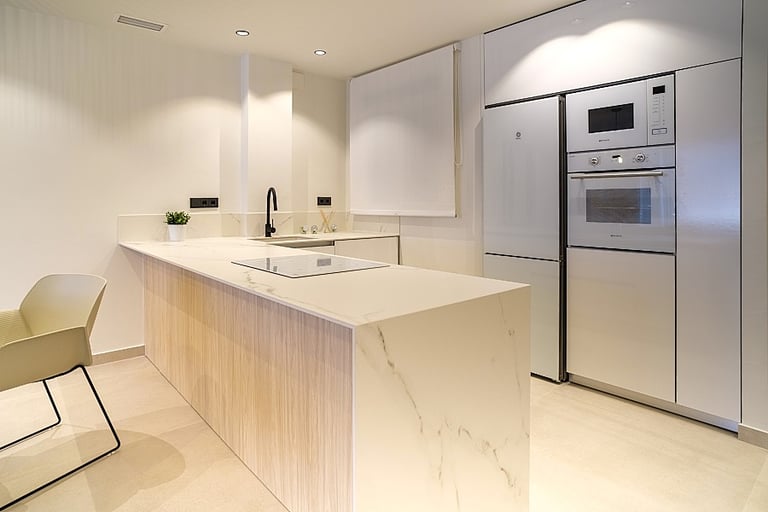 Limpia y despeja completamente la cocina. Guarda los electrodomésticos y utensilios que no sean esenciales para dar una sensación de amplitud y orden. Organiza las encimeras, eliminando cualquier objeto que no sea necesario. Unos pocos elementos decorativos sutiles, como un frutero o una planta, pueden agregar un toque de calidez sin sobrecargar el espacio.